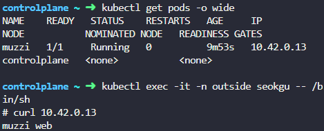 outside ns 의 seokgu에선 muzzi pod와 통신이 안되지만, 같은 default ns의 dori pod에서는 통신이 된다.