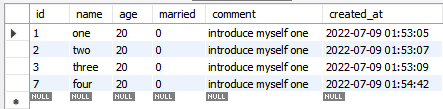 insert into nodejs.users (name, age, married, comment) values ('one', 20, 0, 'introduce myself one');