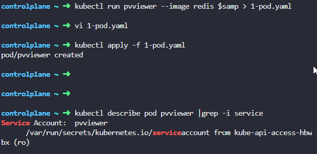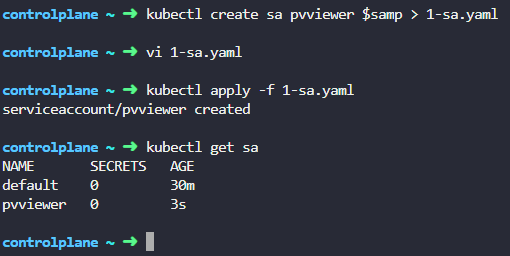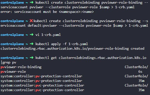 kubectl create clusterrolebinding pvviewer-role-binding --serviceaccount default:pvviewer --clusterrole pvviewer-role