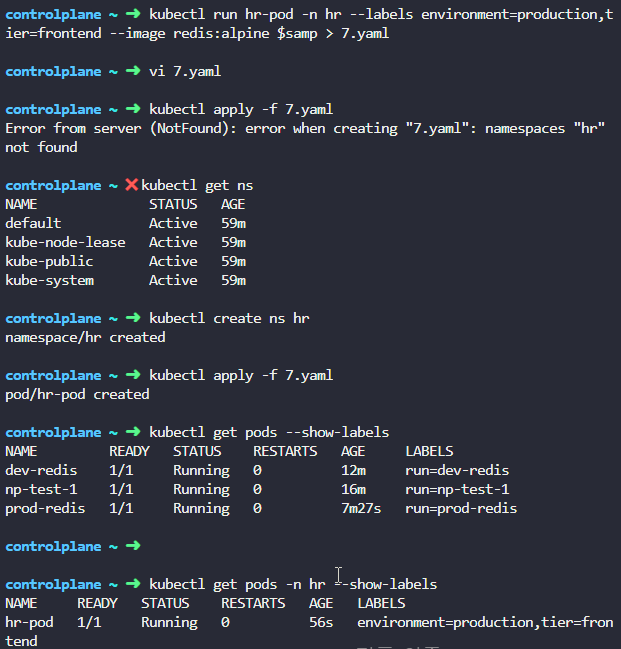 kubectl run hr-pod -n hr --labels environment=production,tier=frontend --image redis:alpine