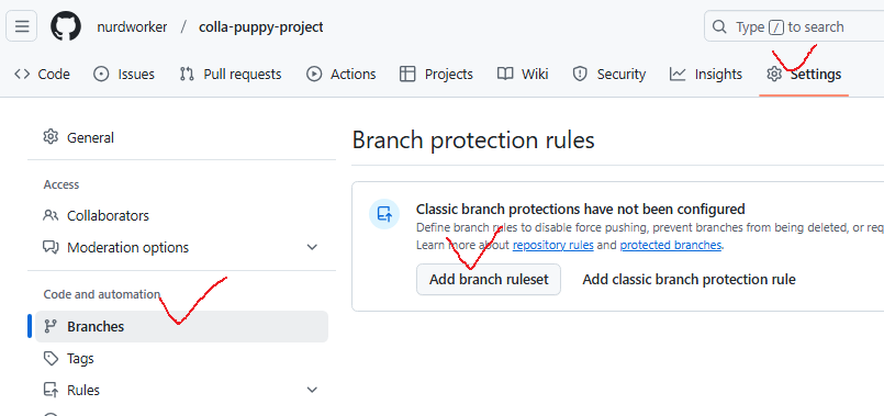 팀장은 해당 레포지토리의 setting을 들어가서 branches에서 add branch ruleset버튼을 클릭한다.