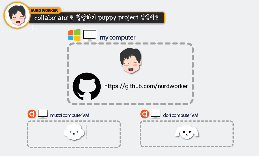 모두 각자의 컴퓨터에서 협업을 하는 그림이기 때문에 무찌와 도리 모두 컴퓨터가 존재하다는 상황을 만들기위해 우분투 이미지로 VM을 팠고 각자의 github의 계정으로 로컬상에 로그인을 해둔 상태임
