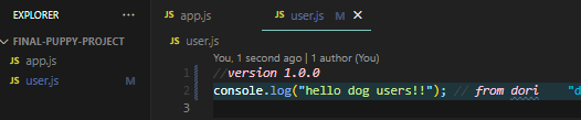 현재 이런 상태이다. 무찌가 feature/user이라는 브랜치를 만들었고, user.js라는 파일을 추가했다.