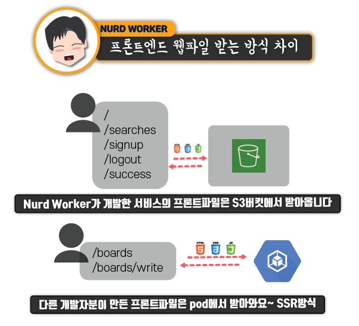그리고 또 다른 팀원분은 board 게시판기능을 위주로 개발하셨는데요. 팀원분이 개발하신 프론트는 SSR방식으로 동작하는데요~ 클라이언트는 이 프론트 데이터를 EKS pod에서 직접 받게됩니다.
