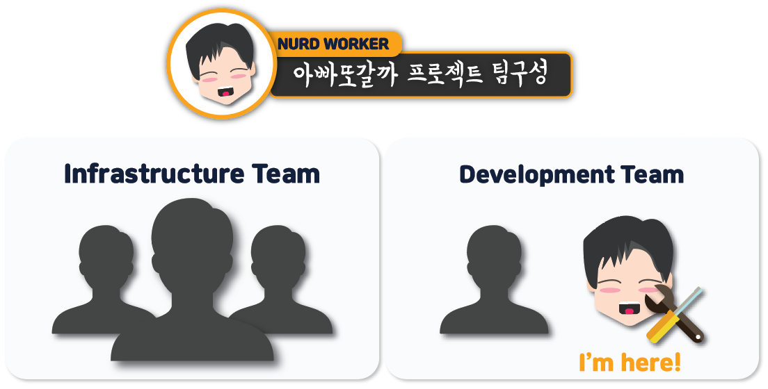 소갯글에서도 적어놨듯이 저희팀은 인프라팀, 개발팀으로 완전한 분업을 하였습니다 ㅎㅎ
