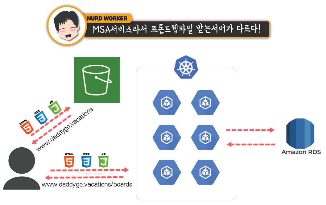 루트 경로(www.daddygo.vacations)로 들어가면 nurd worker가 vue js로 코딩한 SPA방식 프론트데이터를 S3버킷에서 응답받게됩니다. 그림에서 보이시죠?