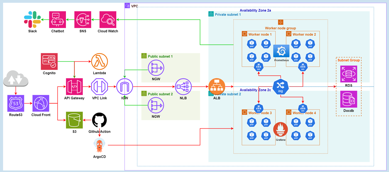 저희 인프라 팀원분들이 만드신 최종 아키텍쳐인데요~ 멋지죠?