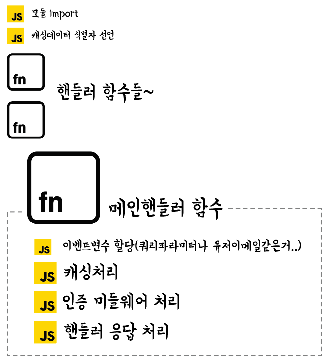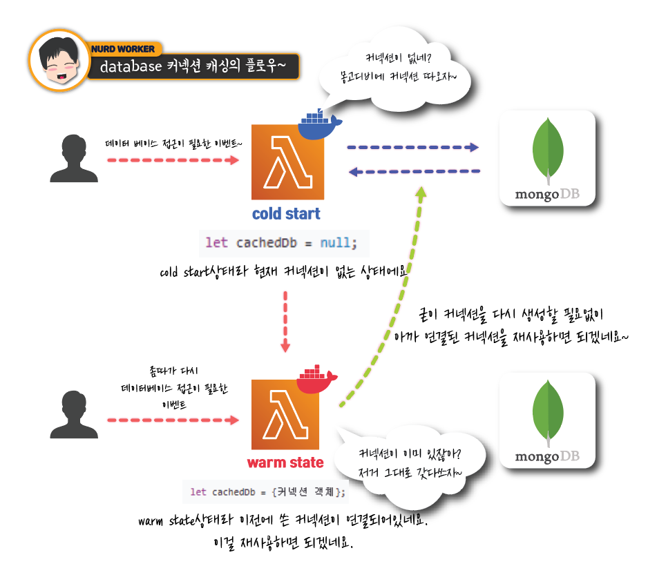 중요한건 람다는 처음 요청을 받으면 cold start상태로 시작되고 초기화가 필요하기때문에 이벤트에대한 응답을 비교적 늦게줍니다는 점이에요. 이후로 오는 이벤트는 이미 한번 사용된 람다 컨테이너를 재사용할수 있으니까 warm state상태라서 더욱 빠른 응답을 주는거죠. 이 부분을 기억해주세요. 밑에 설명할 캐싱기능을 이 람다의 특성들을 고려해서 만들었거든요.