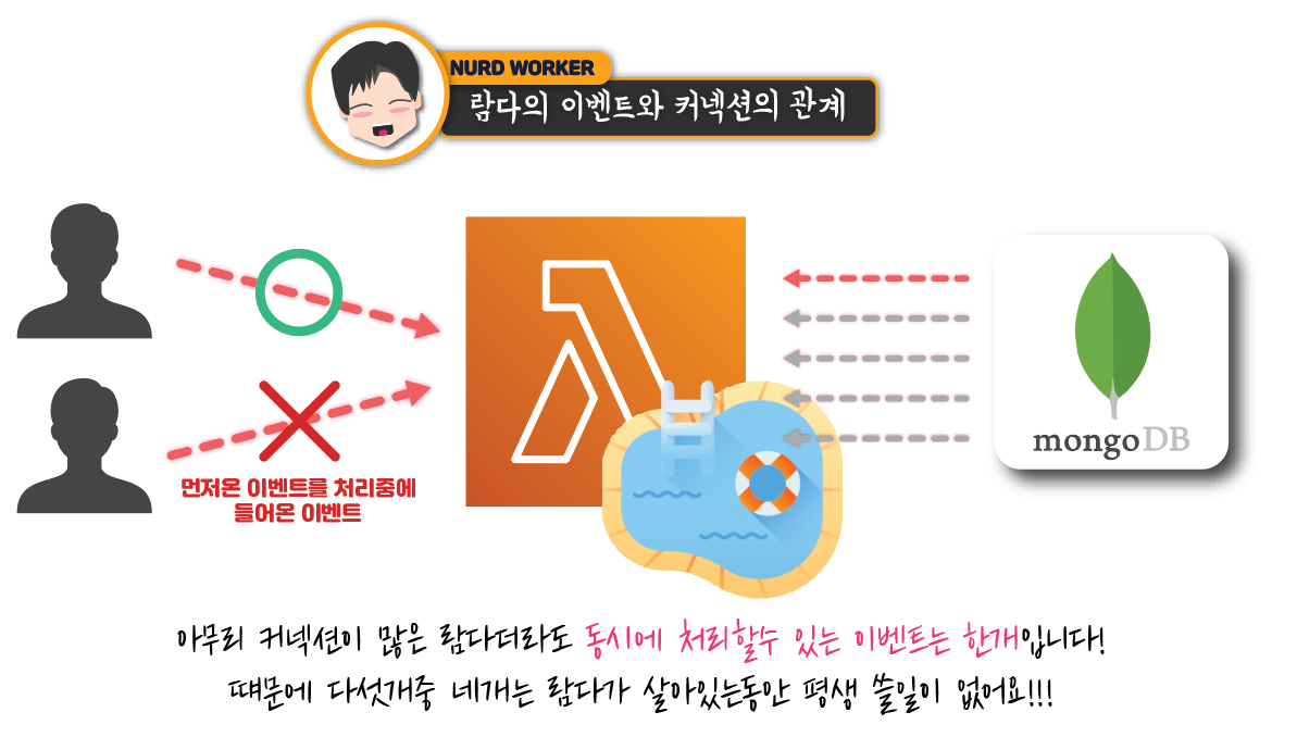 람다는 먼저 들어온 이벤트를 처리하고 있겠죠? 근데 또다른 이벤트가 무찌람다에 요청을 하게되니까 람다는 이걸 동기처리하든, 비동기처리하든 해야한답니다.
