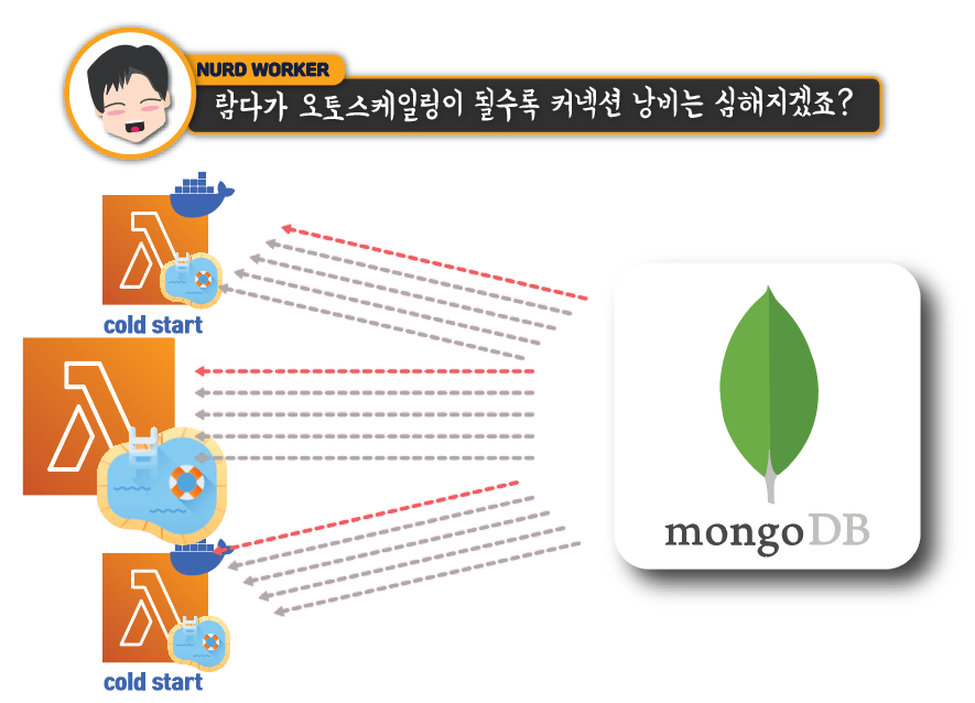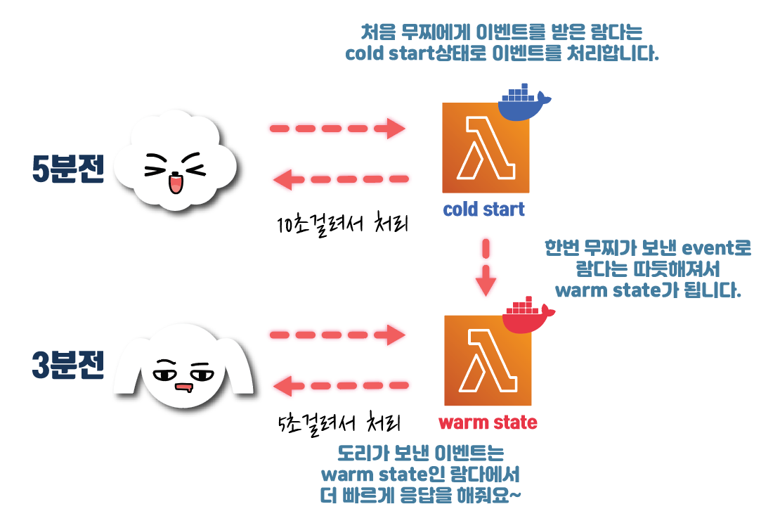 cold start : 람다가 막 시작해서 초기화부터 이뤄져야할 상태에요. 한동안 람다에 이벤트가 없어서 컨테이너가 없는 상태라 다시 만들어야하는 상태입니다.