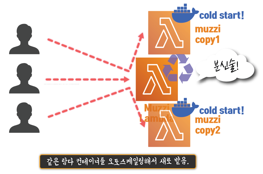 이때 람다는 요청을 처리하기위해 자동으로 오토스케일링이 됩니다!! 똑같은 람다 컨테이너를 여러개 더 만드는거죠.