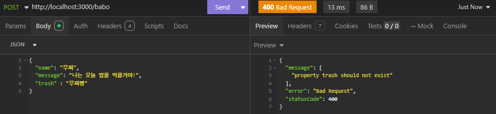 forbidNonWhitelisted: true, // 정의되지 않은 속성이 있으면 400 에러