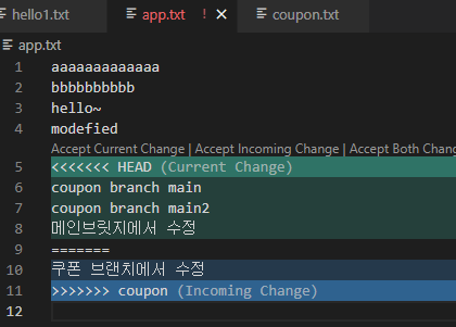 coupon브랜치에서 같은파일 app.txt를 같은줄을 수정했으면 충돌되버림.