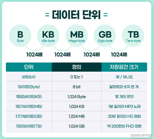 이렇게 데이터 단위는 기본 Btye로 시작해서 2의 배수대로 커지는 시스템이다.