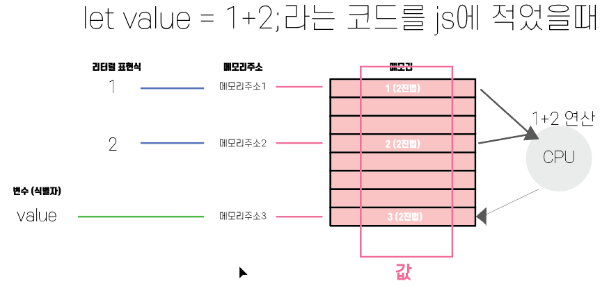 let value = 1+2; //여기서 자바스크립트 엔진이 값 3생성해서 메모리주소에 변수 연결해놓음