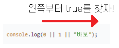 console.log(0 || 1 || "바보");이 코드의 출력물은 어떨까?