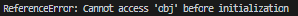 요렇게 참조에러가 뜬다. teamName프로퍼티가 dog1과 dog2를 참조하는건데 teamName프로퍼티가 자기자신 obj를 참조하는 시점이 실행컨텍스트의 코드평가할때 참조하려고해서 참조에러가 뜨는거다. 호이스팅이 발생하는거지.