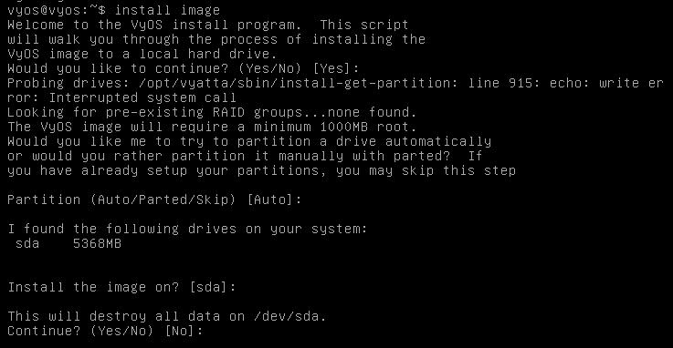 쭉 엔터를 누르다가 비밀번호 입력창이 나오면 'vyos'를 입력해준다. 그리고 나머지 설정도 모두 yes를 눌러준다.