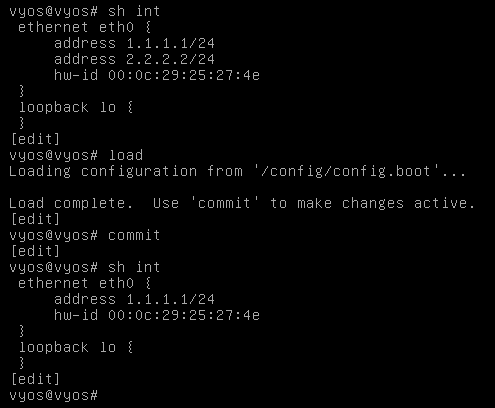 이 상태에서 commit을 치면 eth0에 2.2.2.2/24주소가 사라지는데 여기서 discard명령어를 치면?