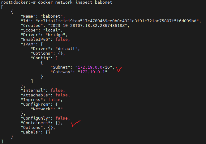 또한 해당 네트워크에 연결된 컨테이너를 Containers라는 프로퍼티에서 확인할 수 있는데, babonet은 만들기만 헀으니 아직 연결된 컨테이너가 없다.
