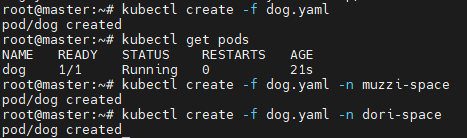 이전에 muzzi_space, dori_space를 만들어주었고 해당 네임스페이스에 각각 dog라는 pod를 만들어주었기 때문에, 중복된이름 에러를 띄우지 않는것이다.