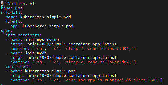 첫번째로는 myservice라는 init 컨테이너는 myservice라는 서비스가 발견될때까지 계속 기다리고 서비스가 발견되면 생성되고, mydb라는 컨테이너도 같은 로직으로 mydb라는 서비스가 발견되야 생성되는 로직으로 sh스크립트파일이 커맨드에 들어있다.