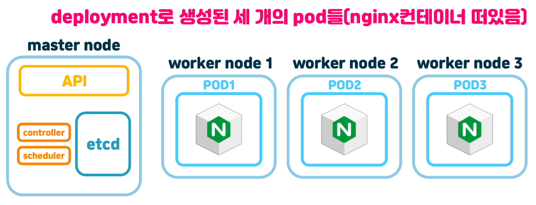 이렇게 deployment로 생성된 세개의 nginx pod들이 있다고 가정하자.