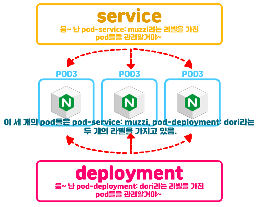 또한 컨트롤러도 selector이 있다. 이전 포스팅에서 많이 설명했지만 위에 yaml양식에서 pod-deploymen: dori라는 라벨링으로써 delpoyment의 selector가 이 라벨링을 가진 pod들을 관리하게 될것이다.