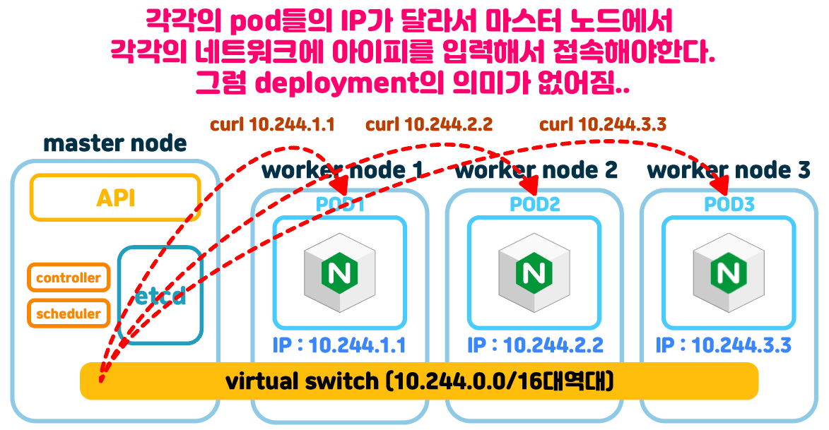 이렇게 세개의 동일한 pod들을 배포해줬고 deployment컨트롤러가 가용성을 보장해준다. 근데 이 세개의 pod들안에서 nginx컨테이너가 띄운 웹사이트들은 다 똑같지만 접속하려면 서로 다른 아이피로 접속을 해야한다. 그러면 의미가 없을텐데?