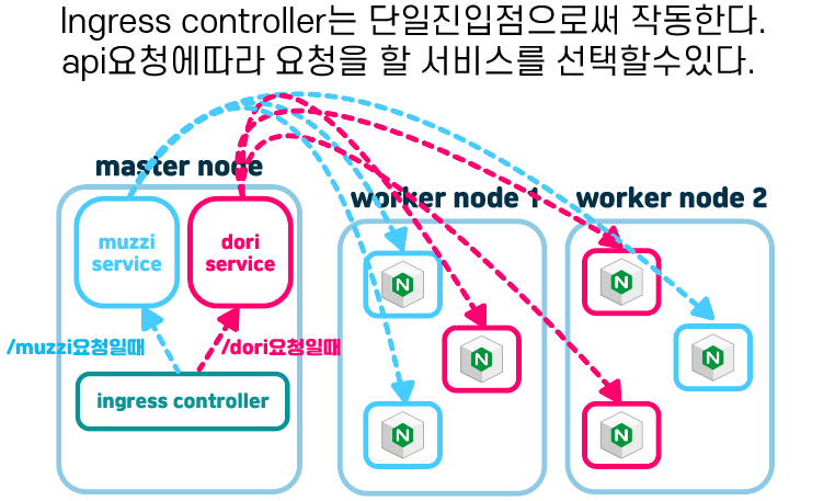 ingress controller가 있고 이곳이 단일진입점이 된다. 외부에서 접속하는것이기때문에 서비스 타입은 NodePort이며, pod는 그림과 달리 다른 노드에도 있을 수 있으나, 이해를 쉽게하기 위해 마스터노드에 그렸다.