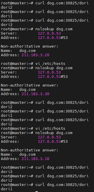 그다음 worker2노드, master노드 모두 dog.com으로 호스트를 지정해주고 똑같이 테스트해봤으나 모두 작동했다.