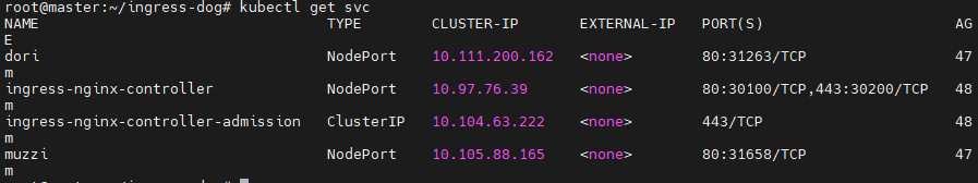 아까 우리가 만들었던 muzzi, dori서비스들이 생성되어있고, ingress-nginx-controller가 있다.