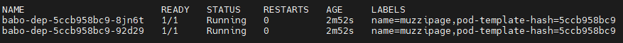 테스트를 위해서 deployment로 pod들을 생성해봤는데, name=muzzipage라는 라벨링은 yaml에서 명시적으로 해줬는데, 저기 뒤에 있는 pod-template머시기 라벨링은 해준적이 없다.