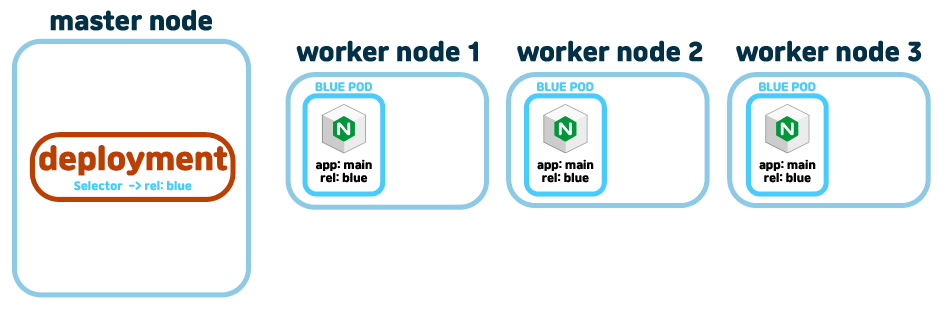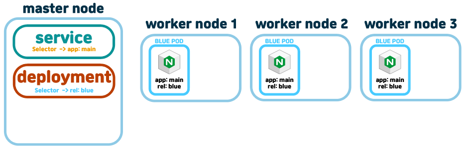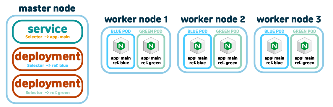 맨처음은 deployment가 blue만 있다. 신버전인 rel: green 태그가 달린 deployment를 배포할때, service의 app: main셀렉터는 유지한채, 각각 deployment에서 rel: blue, rel: green으로 두개의 deployment를 생성하여 배포한다.