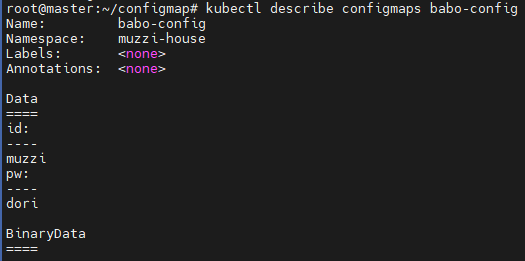kubectl create configmap babo-config --from-literal=id=muzzi --from-literal=pw=dori