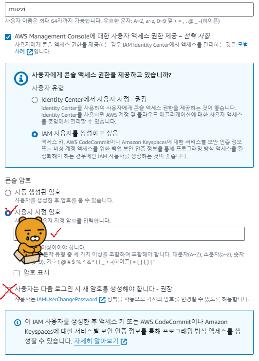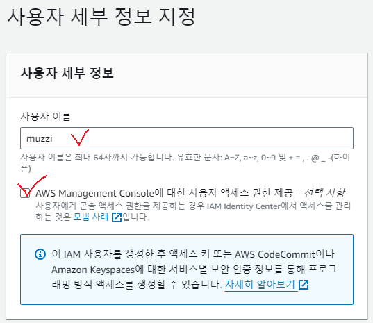 콘솔액세스에 MFA없이 활성화라고 되어있는데 안전한 로그인을 위해서 MFA설정을 해주는게 좋다.(거의 필수임.