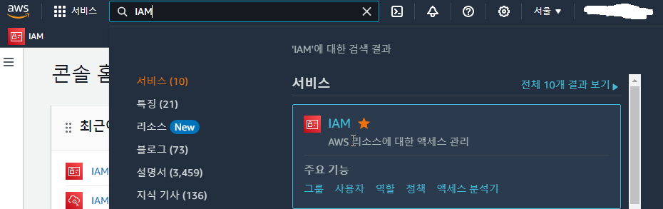 aws 콘솔에서 IAM을 검색해서 IAM콘솔로 드가자.
