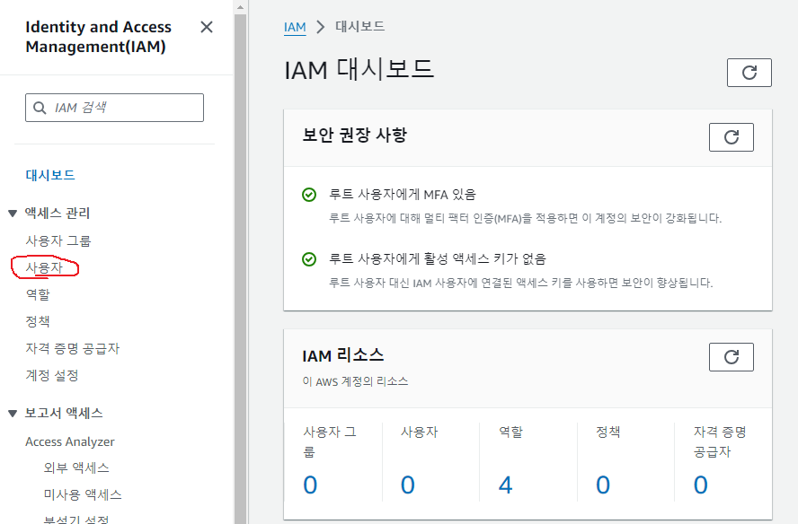 이렇게 IAM대시보드로 들어가지는데 저기 '사용자'탭으로 접속해라