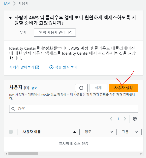 IAM유저 콘솔에서 사용자탭을 클릭하면,