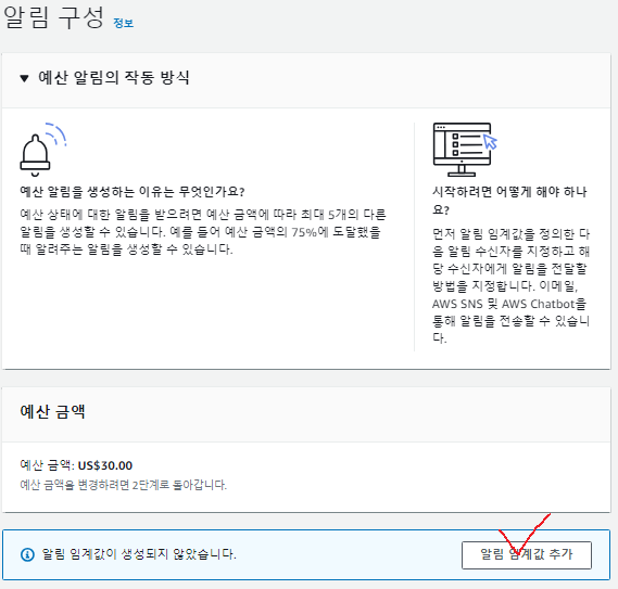 다음버튼을 누르면 알림을 구성 할 수 있는데, 아래 알림임계값 추가 버튼을 누르자.