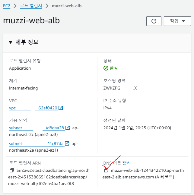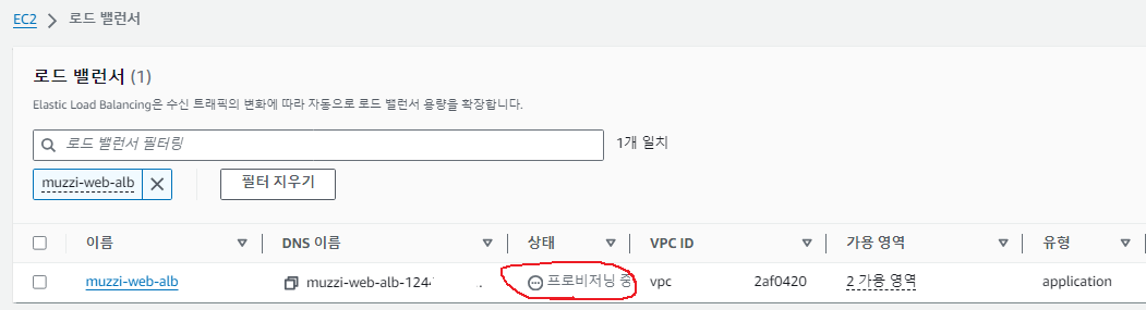 막 생성한 muzzi-web-alb가 프로비저닝 상태이다.