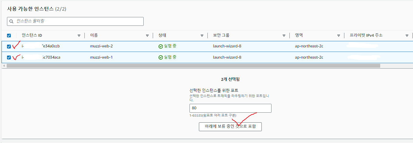 둘다 2c라는 가용영역에 만들어진 인스턴스이므로 위에 선택할 가용영역중 2c로 끝나는 영역은 필수로 해주고 두개 이상 체크해줘야하니 나머지 하나는 아무거나 선택해주면 된다.