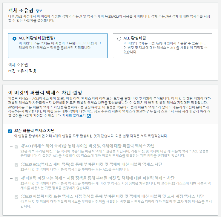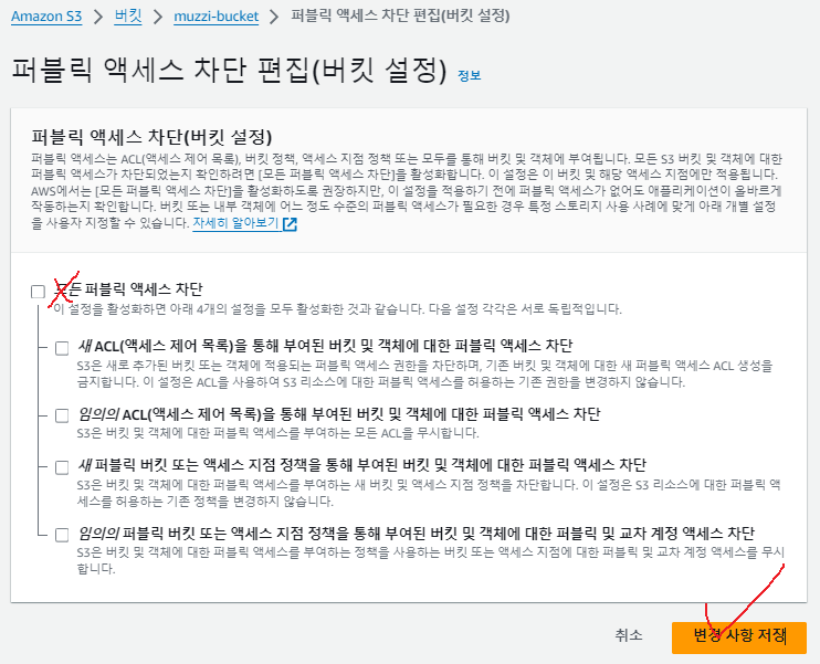 버블릭 엑세스 차단이 활성화 되어있다. 우리가 버킷만들때 기본설정으로 하였는데