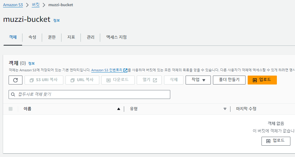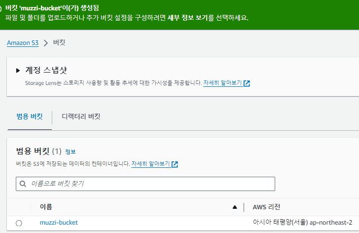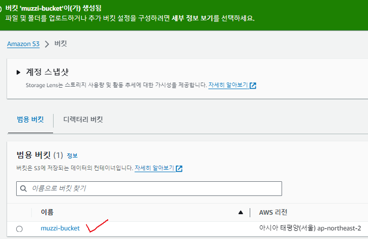 버킷이름을 정해주자. 난 muzzi-bucket으로 잡았다.