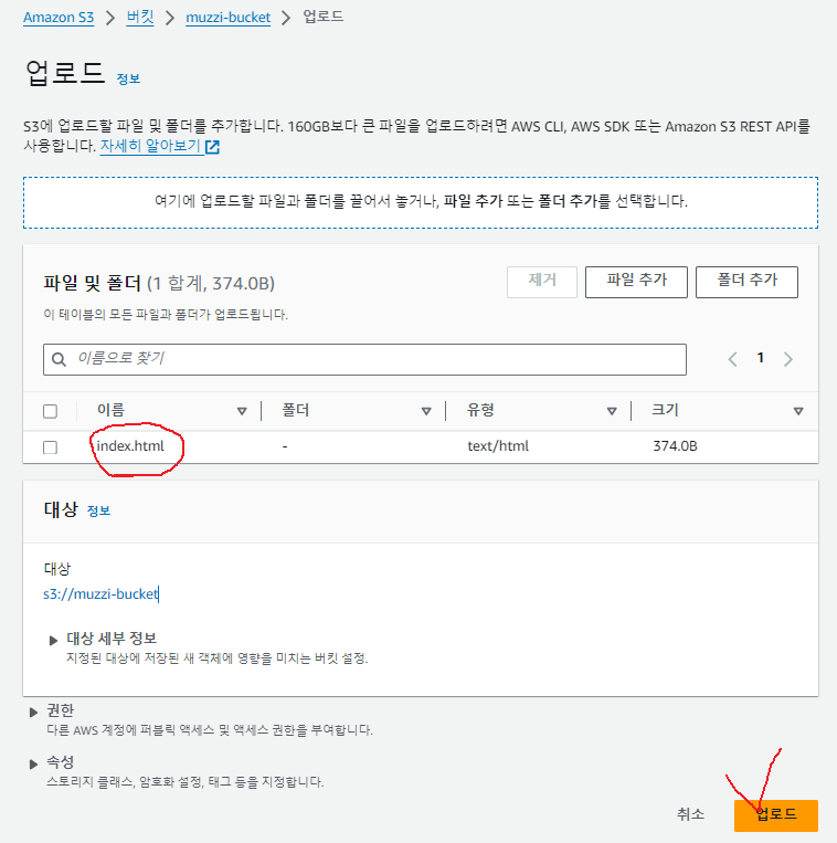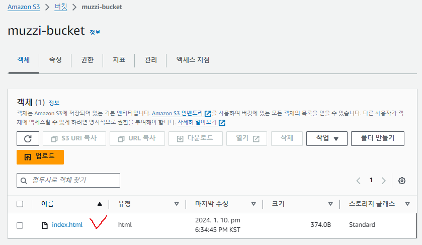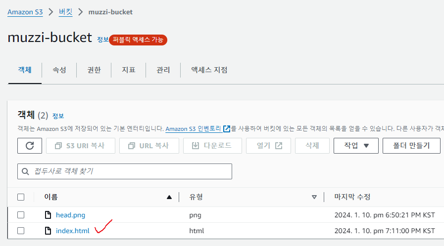 아까 muzzi-bucket안에 index.html파일도 넣어놨었다.