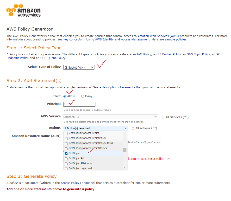 정책생성기 창으로 돌아와서 복사한 ARN을 저기 ARN 입력창에다가 복분하고 마지막으로 'Add Statement'버튼을 눌러주자.