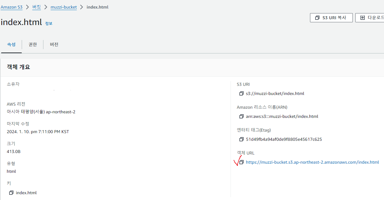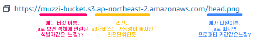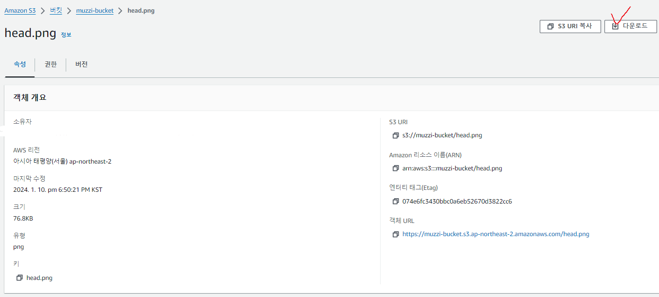 일단 s3에 muzzi-bucket이라는 버킷을만들고 여기에 이미지 파일 head.png란 이름으로 하나 넣었다. 그리고 속성을 보자.