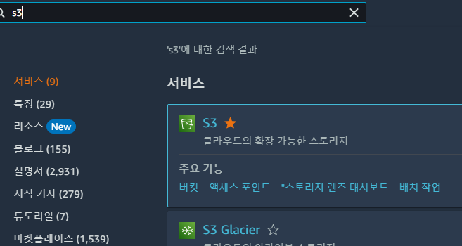 콘솔 검색창에 s3검색하자. s3콘솔로 ㄱ
