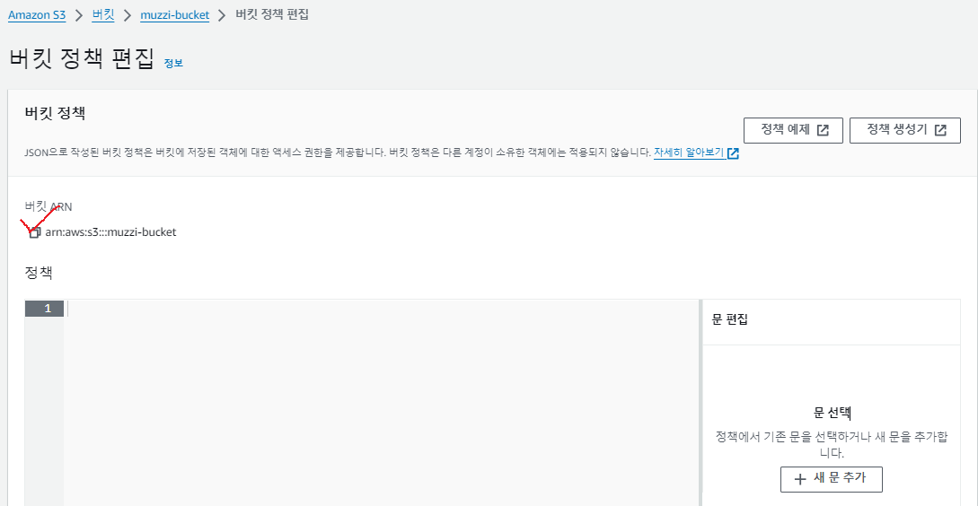 버킷정책에 이 정책이 어떤 버킷에 사용될건지 명시해줘야하기때문에 복사한다.