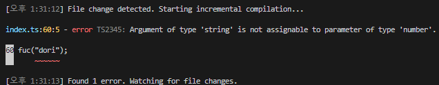 이렇게 왜 파라미터는 숫자타입인데 fuc('dori')로 문자타입을 인수로 넣어 호출하려 하느냐? 하면서 뭐라고함